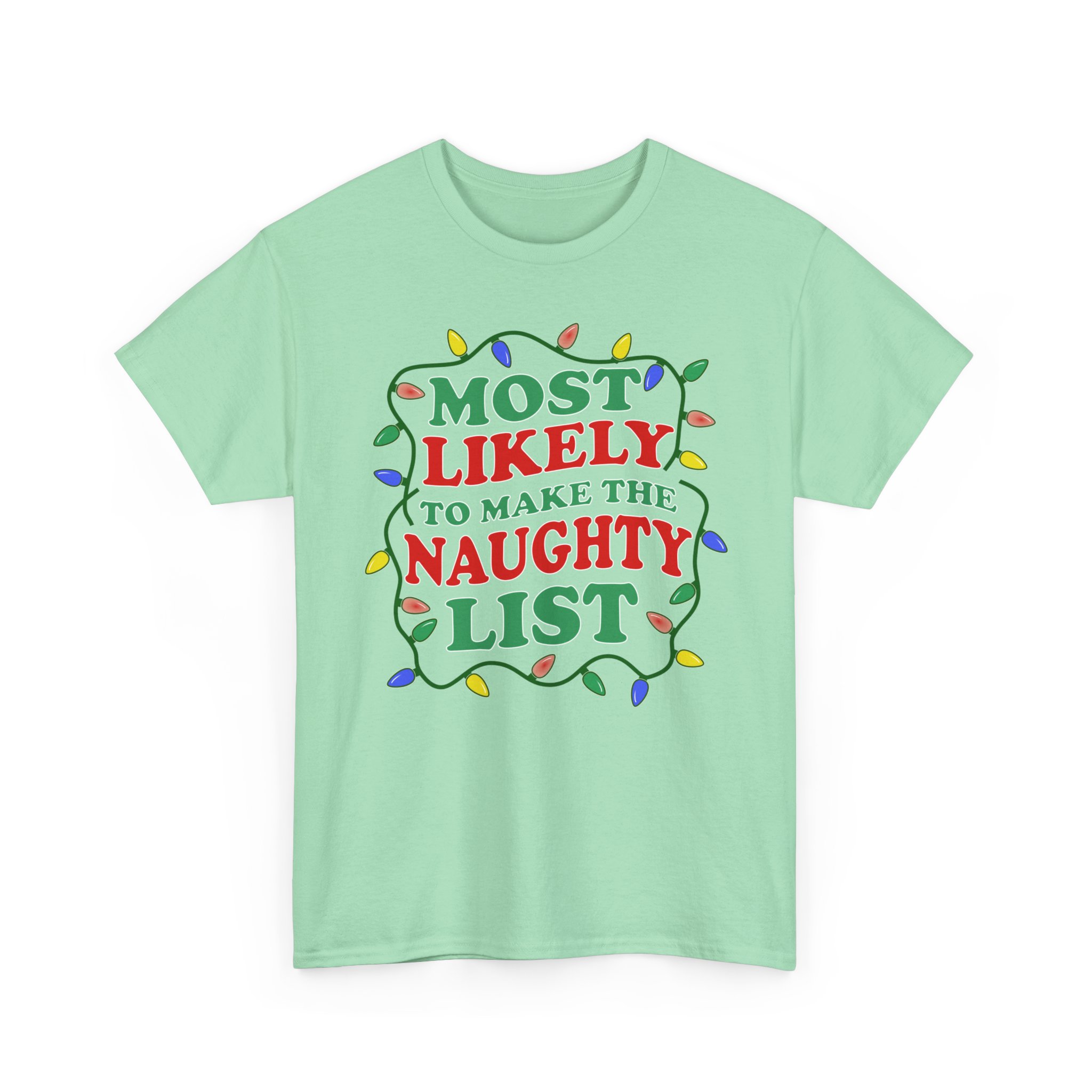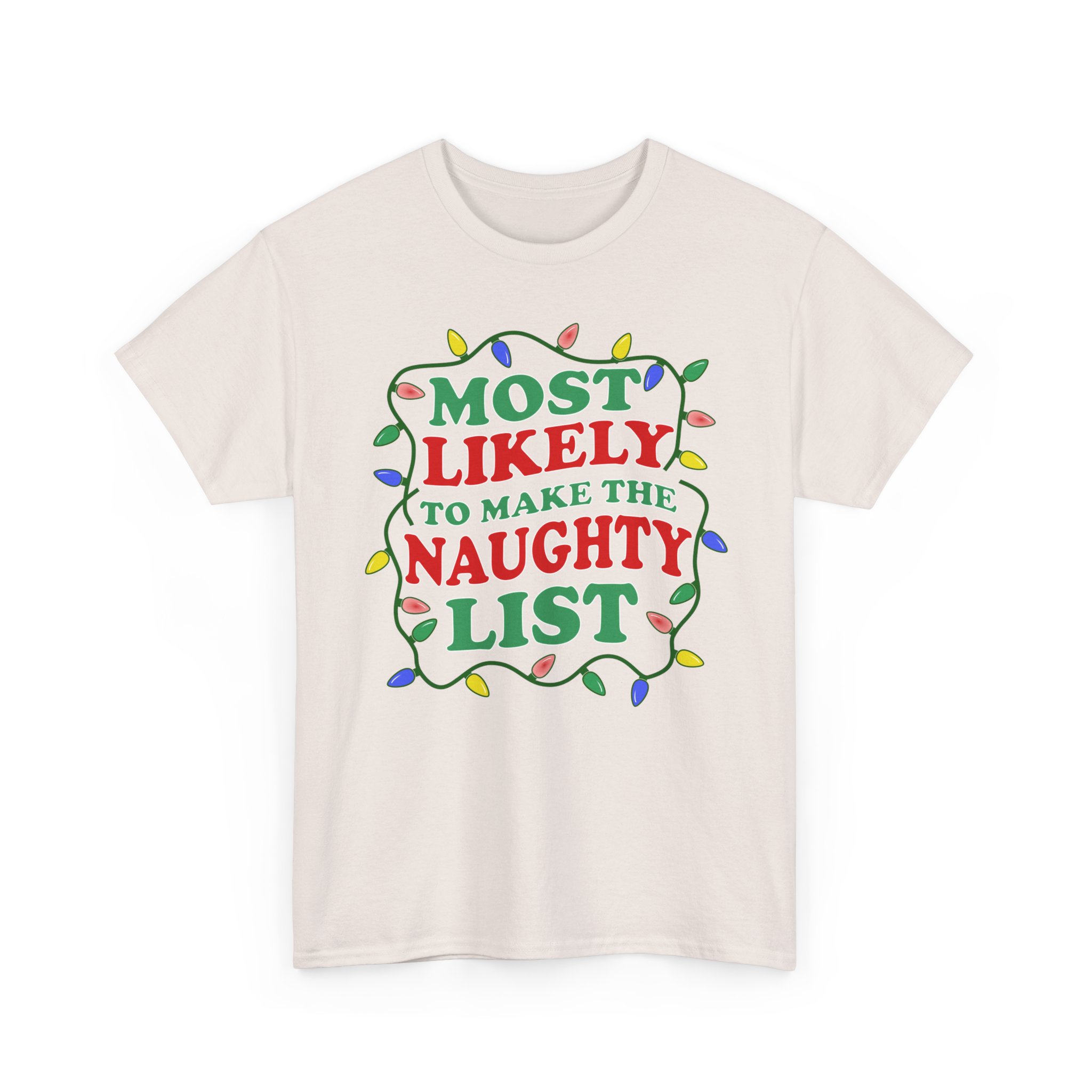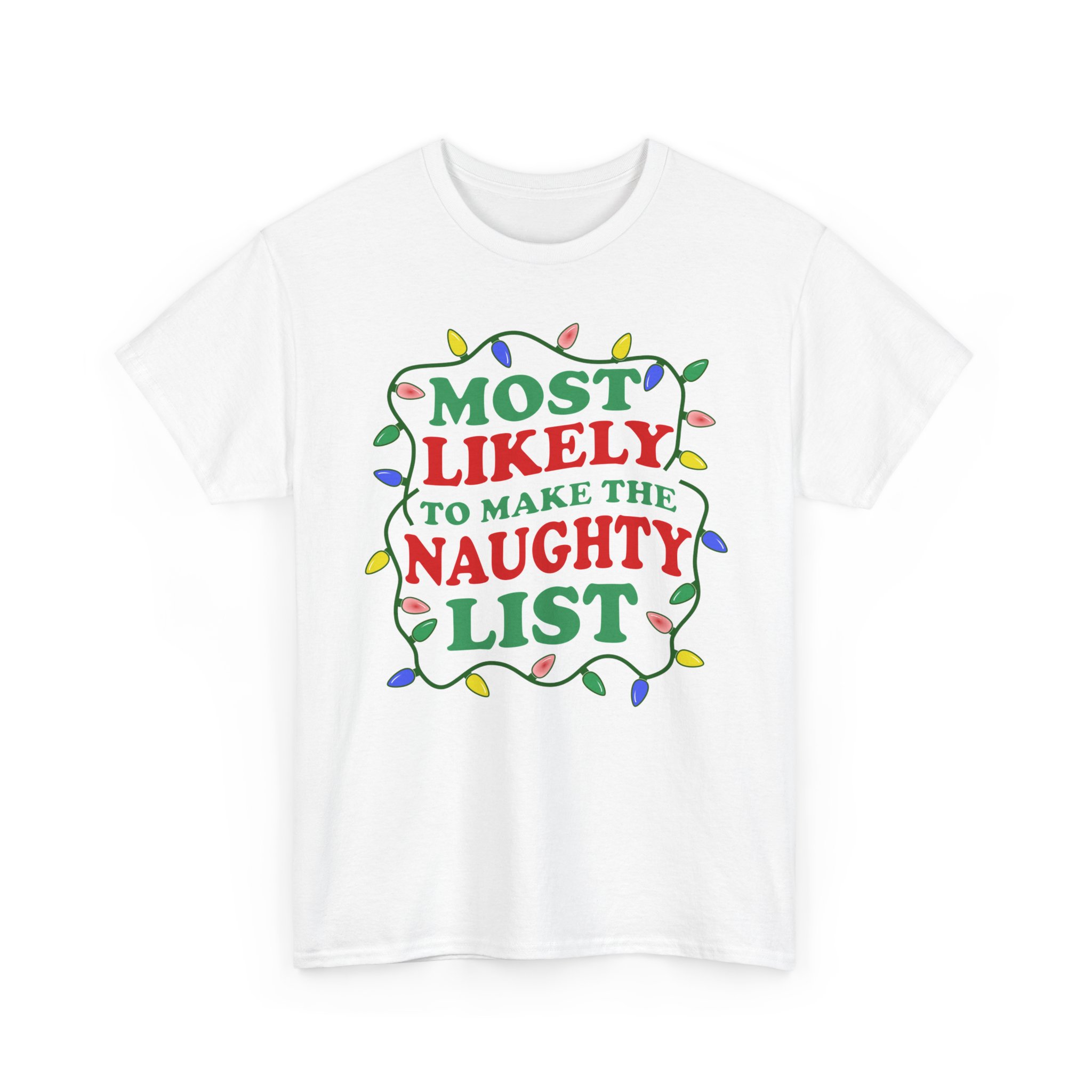 Christmas Graphic T-shirt Design. Wavy text saying “Most Likey to be make the Naughty list” with light string