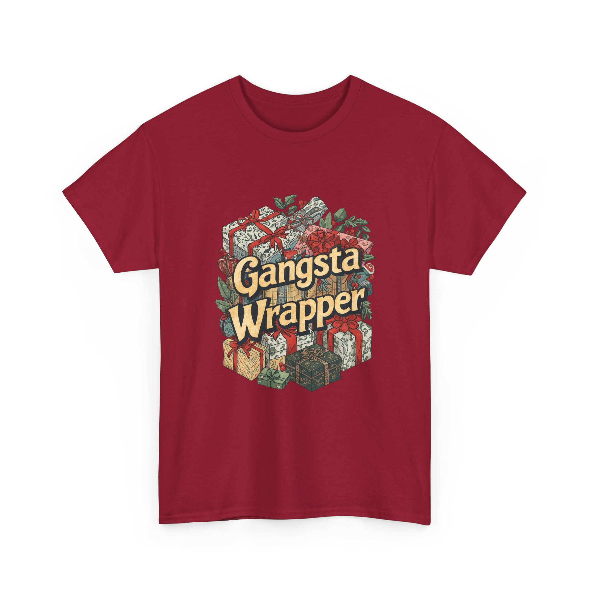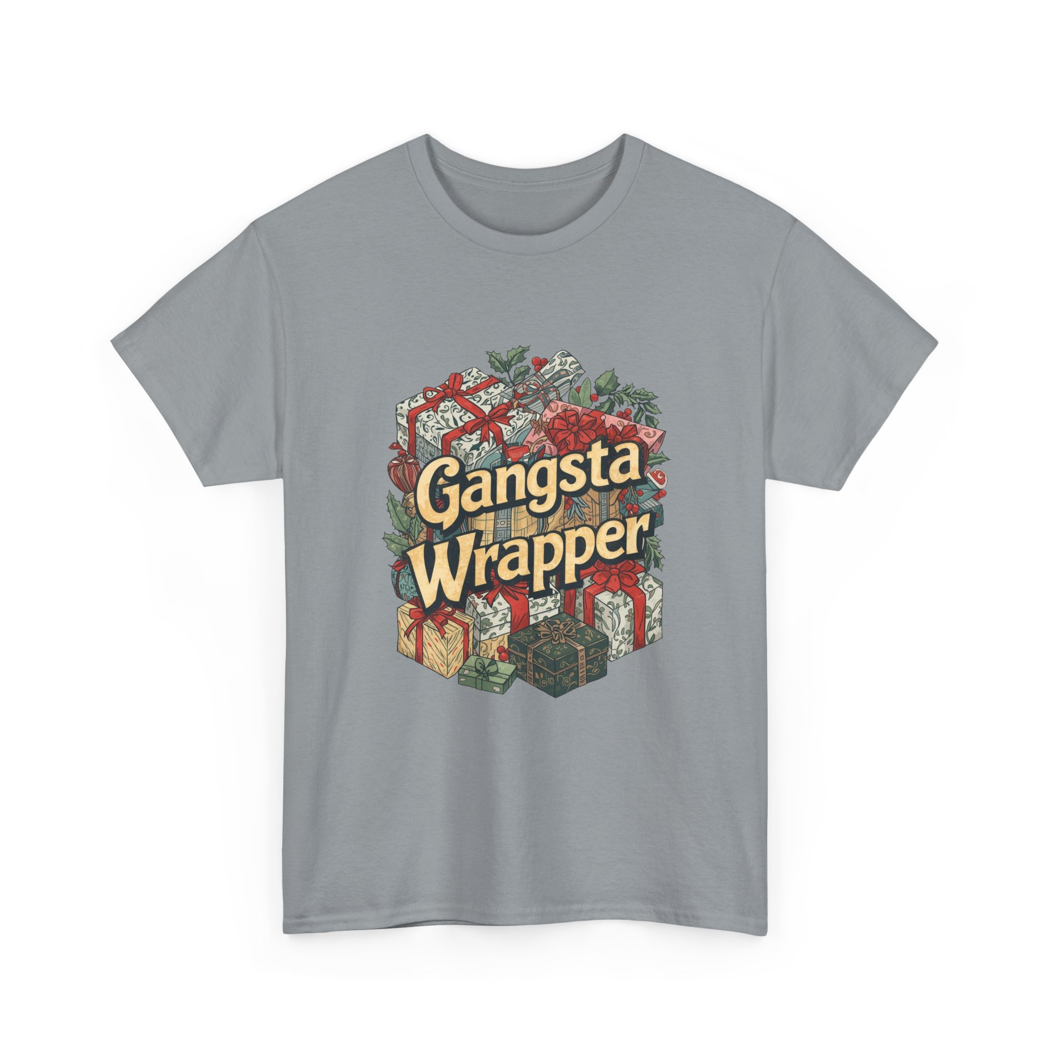 Christmas Graphic T-shirt Design. A Christmas themed t-shirt with some wrapper paper and package images the words “Gangsta Wrapper.”