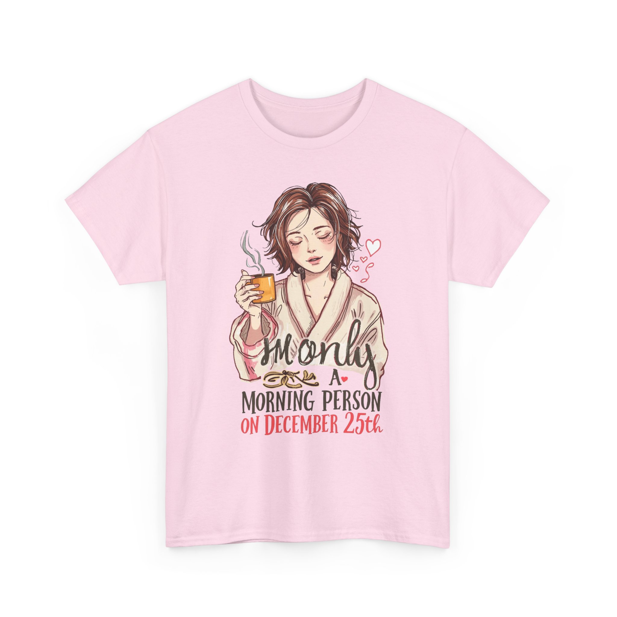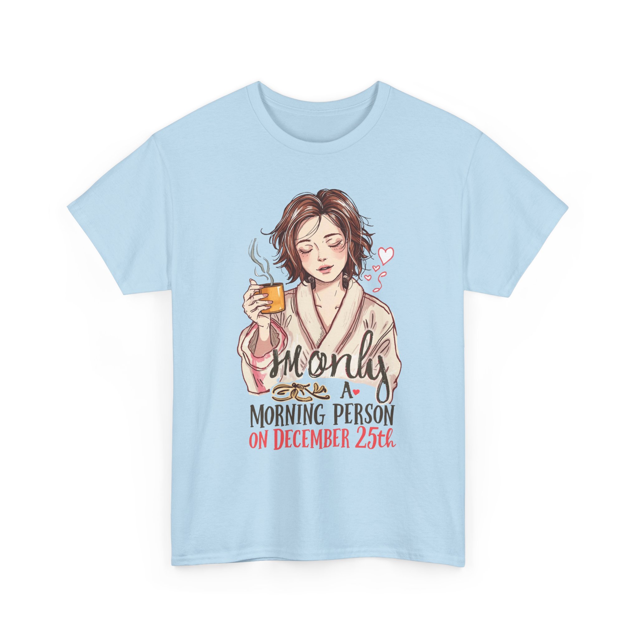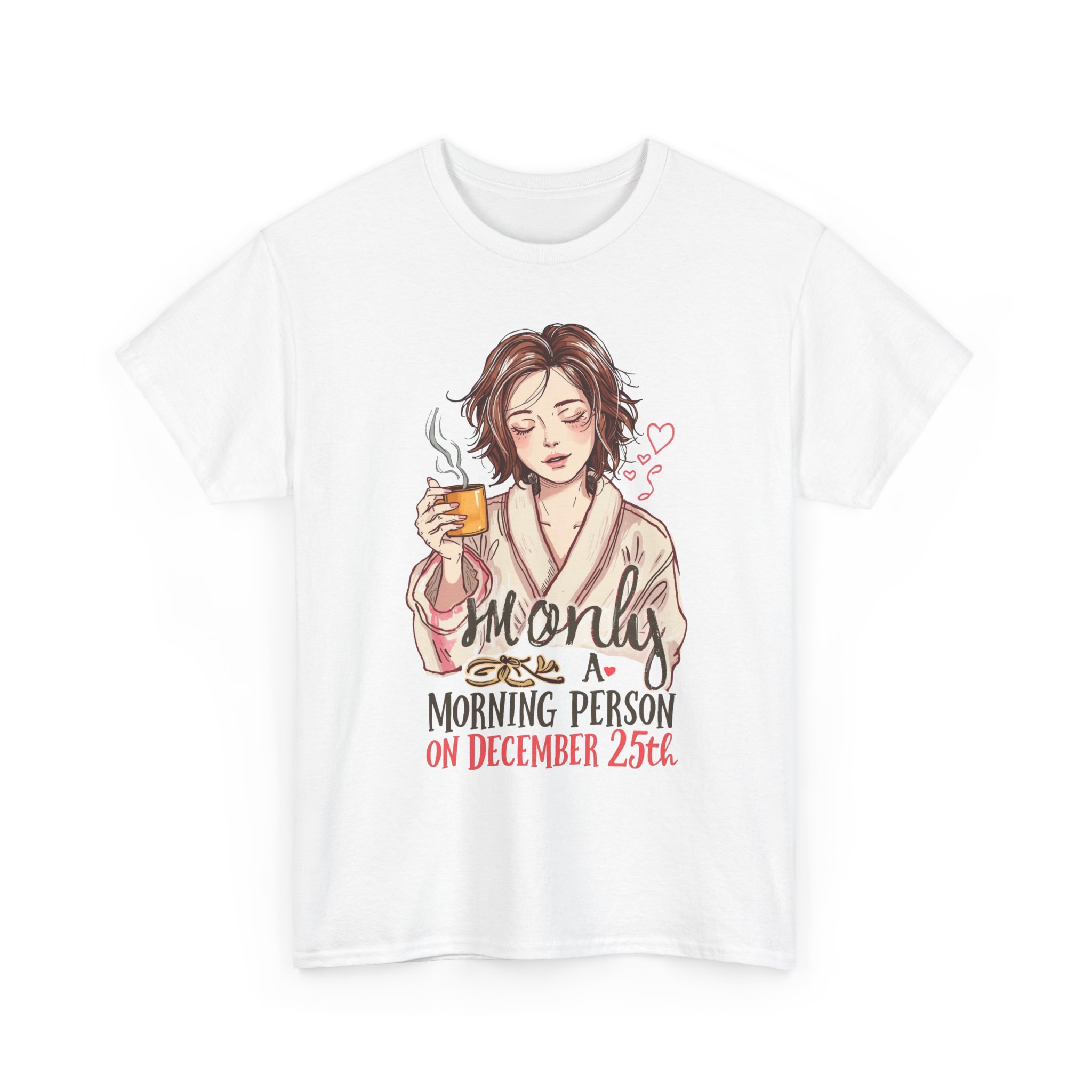 Christmas Graphic T-shirt Design. A Christmas themed t-shirt of a women in a robe and holding coffee with messy hair like she just got out of bed and saying “I’m only a morning person on December 25th.”