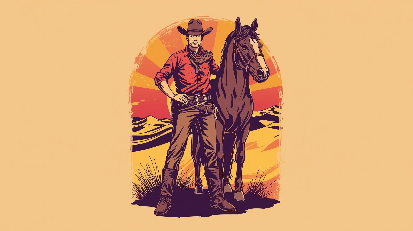 Cowboy graphic t-shirt design. Cowboy with red shirt and tan pants standing by horse in the desert with sunset