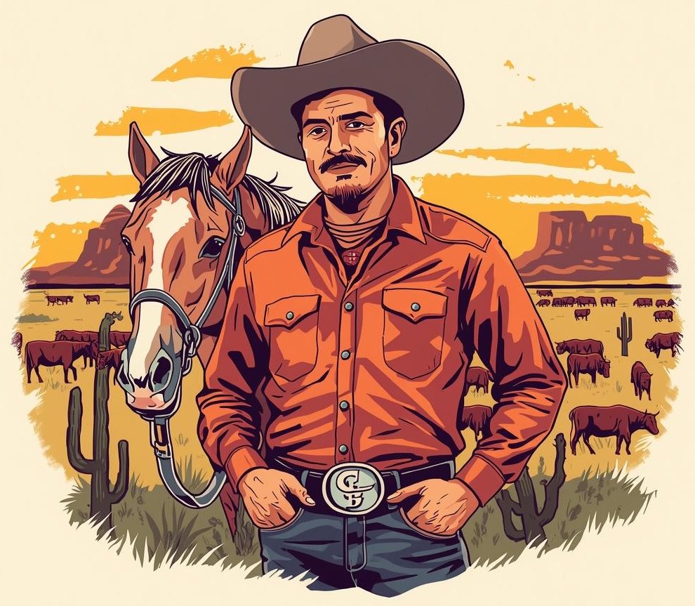 Cowboy graphic t-shirt design. Cowboy with tan shirt and horse in the desert with cattle, cactus, mountains and sunlit sky