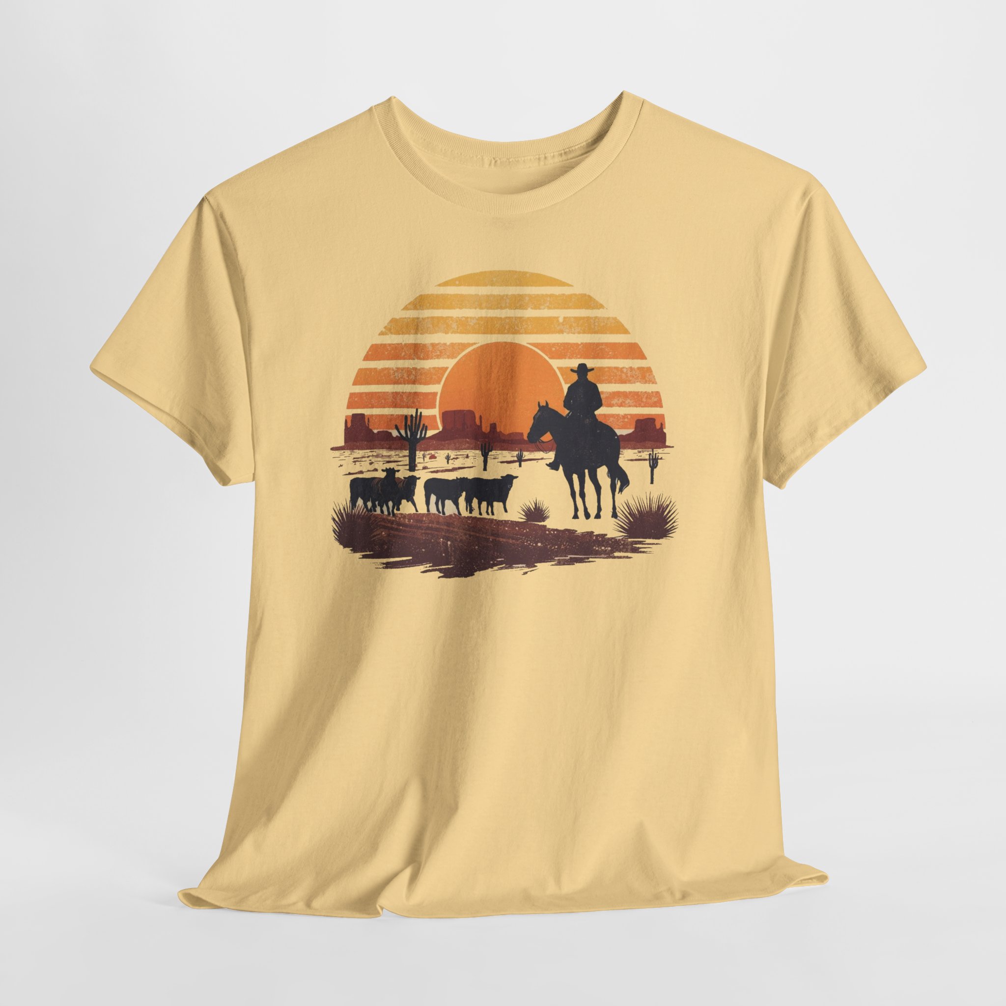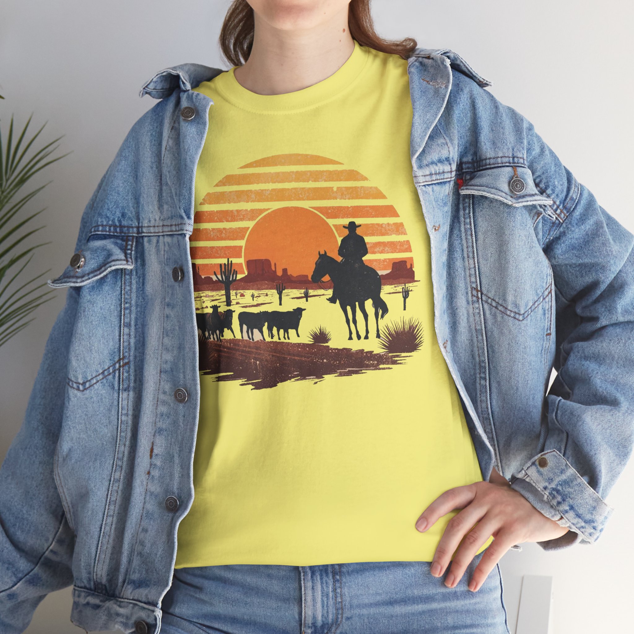 Cowboy graphic t-shirt design. Cowboy and cattle silhouette in the desert with cactus, mountains and sunset