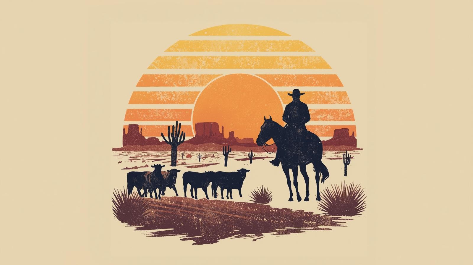 + Free ShippingCowboy and cattle silhouette in the desert with cactus, mountains and sunset