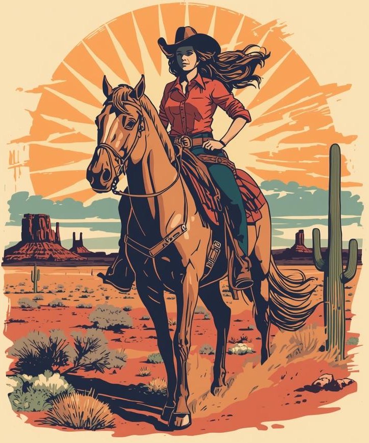 Cowgirl Graphic T-shirt Design. Cowgirl in red shirt and blue jeans, her hair blowing in the wind riding a horse in the desert with cactus, mountains, and sun in the background.