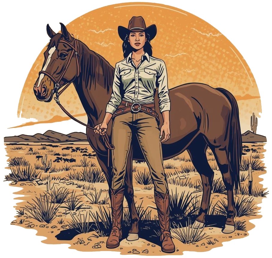 Cowgirl Graphic T-shirt Design. Cowgirl in tan shirt and tan jeans, with dark hair with a horse in the desert with brush and mountains and sun in the background.