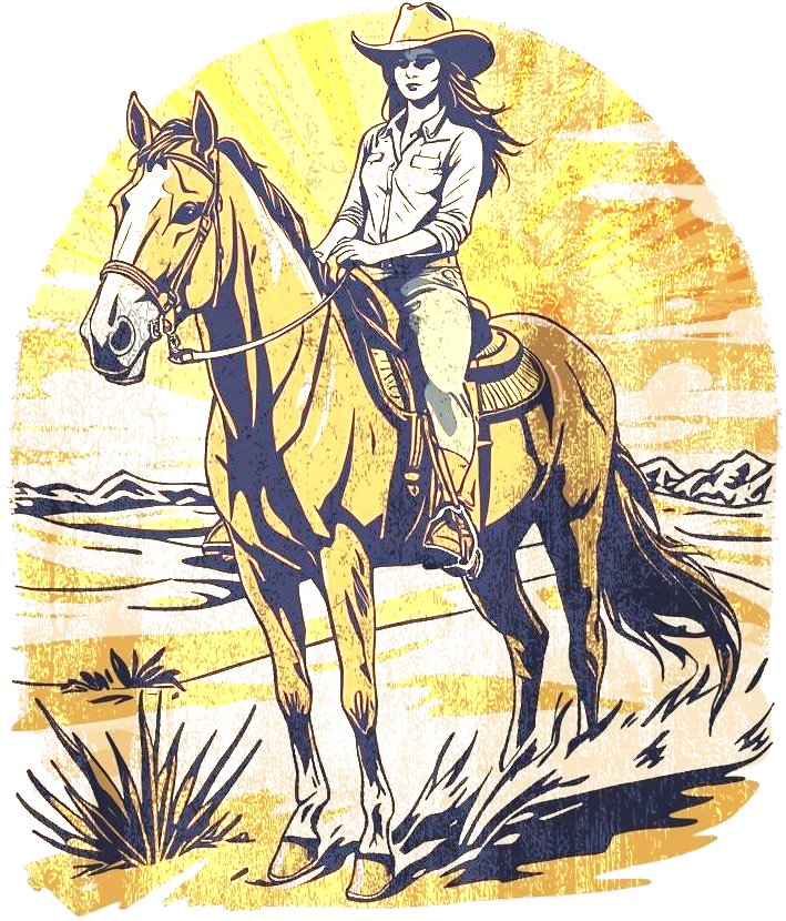 Cowgirl Graphic T-shirt Retro worn look Design. Cowgirl in white shirt and jeans, with blonde hair blowing in the wind with a horse in the desert with brush and mountains and sun in the background.