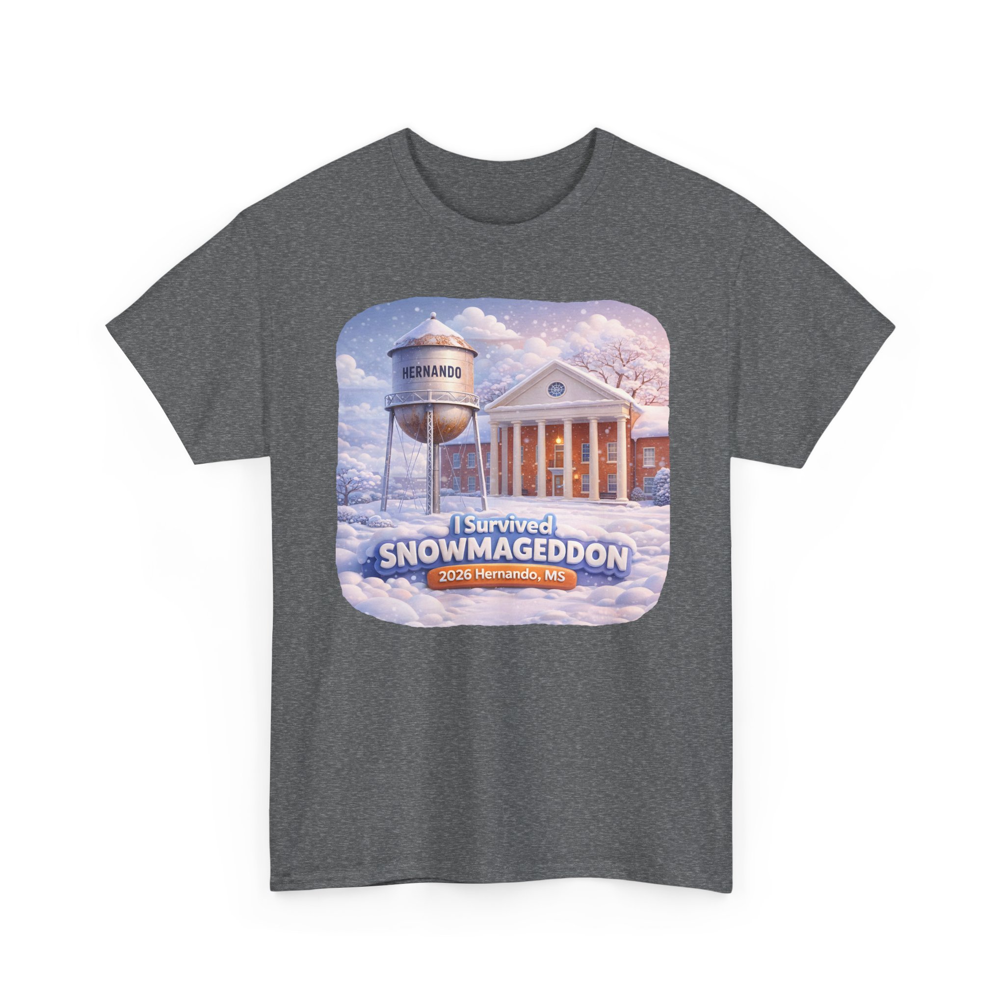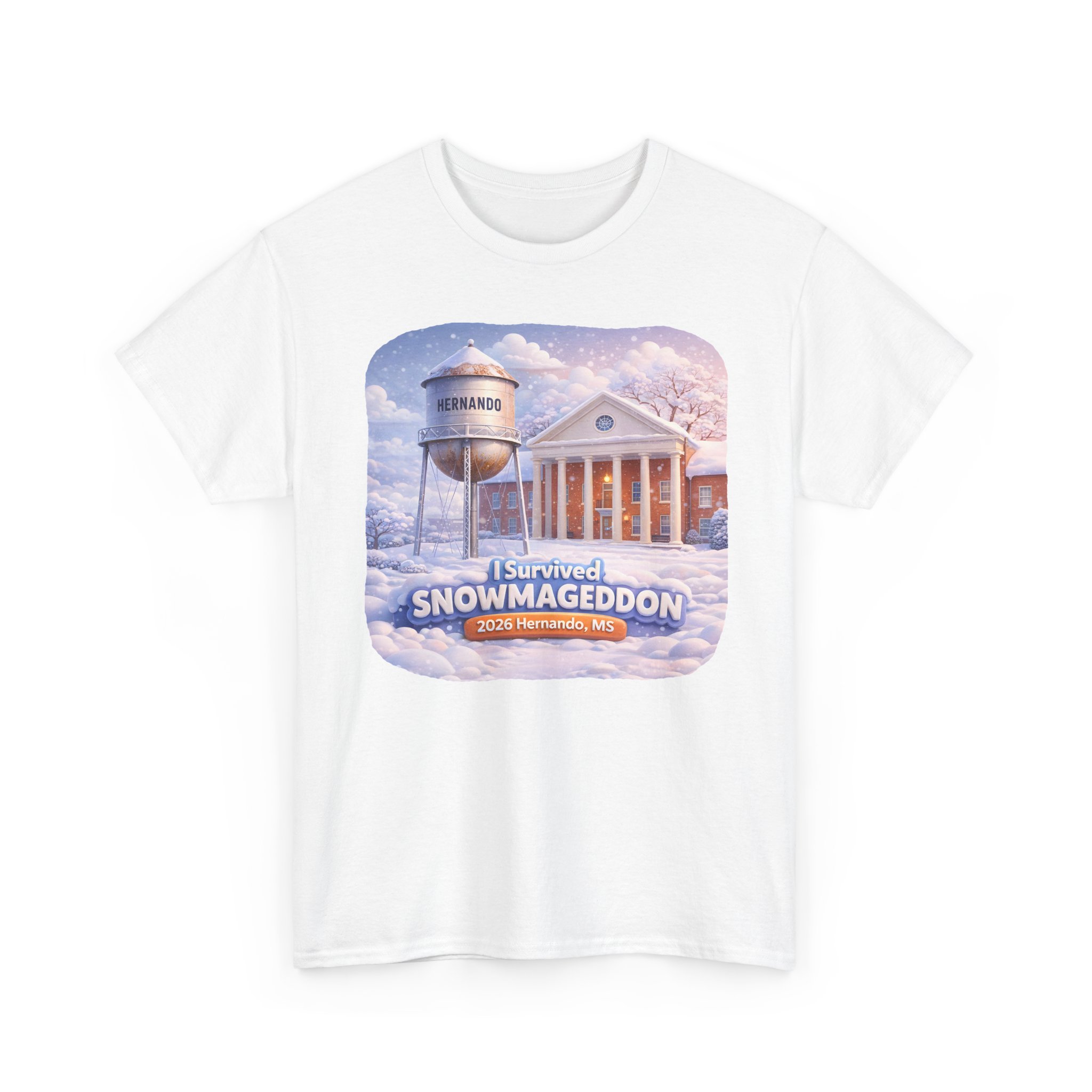 Special Graphic T-shirt Design. Snowy scene with text saying “I Survived Snowmageddon 2026 Hernando, MS” with the Hernando Courthouse and water tower.