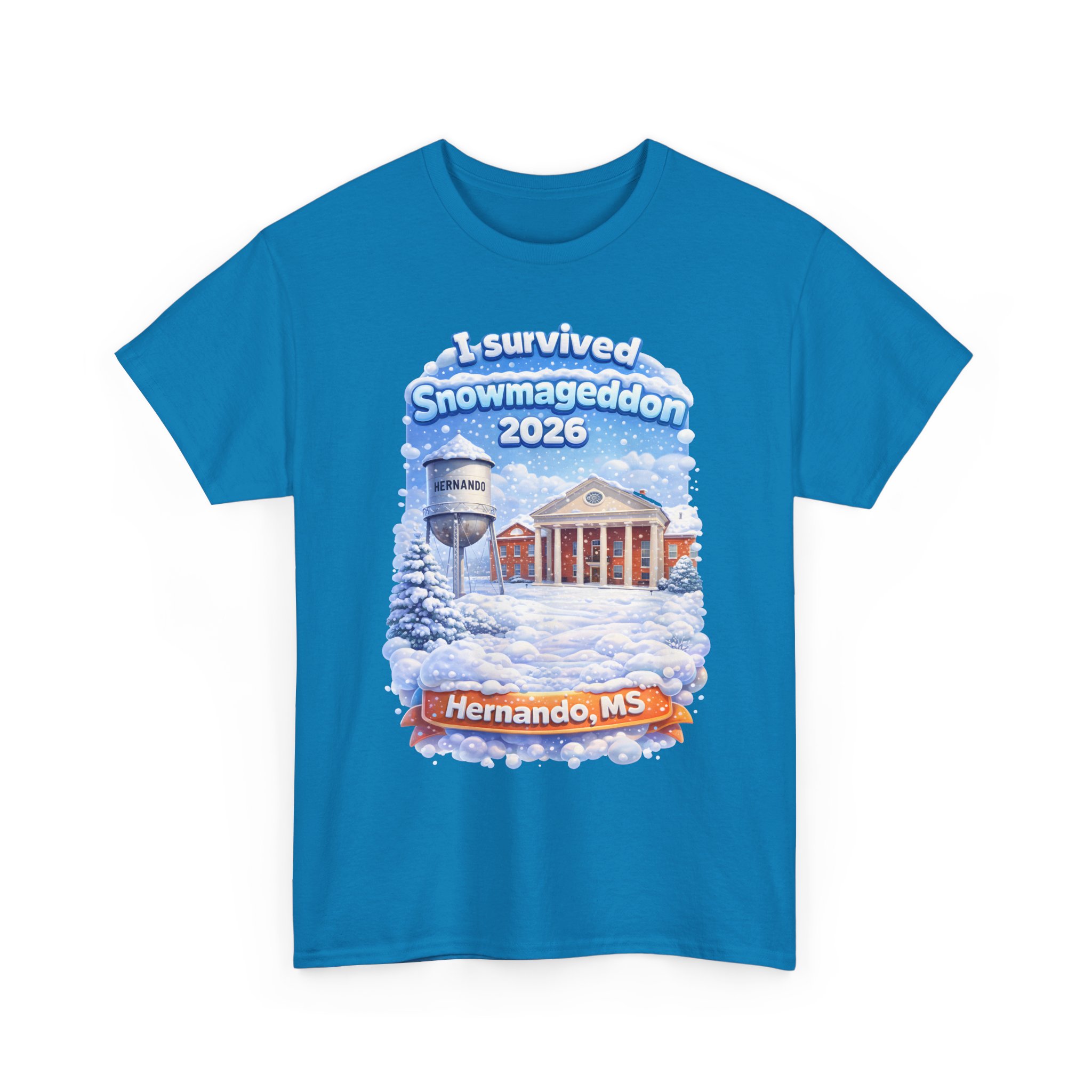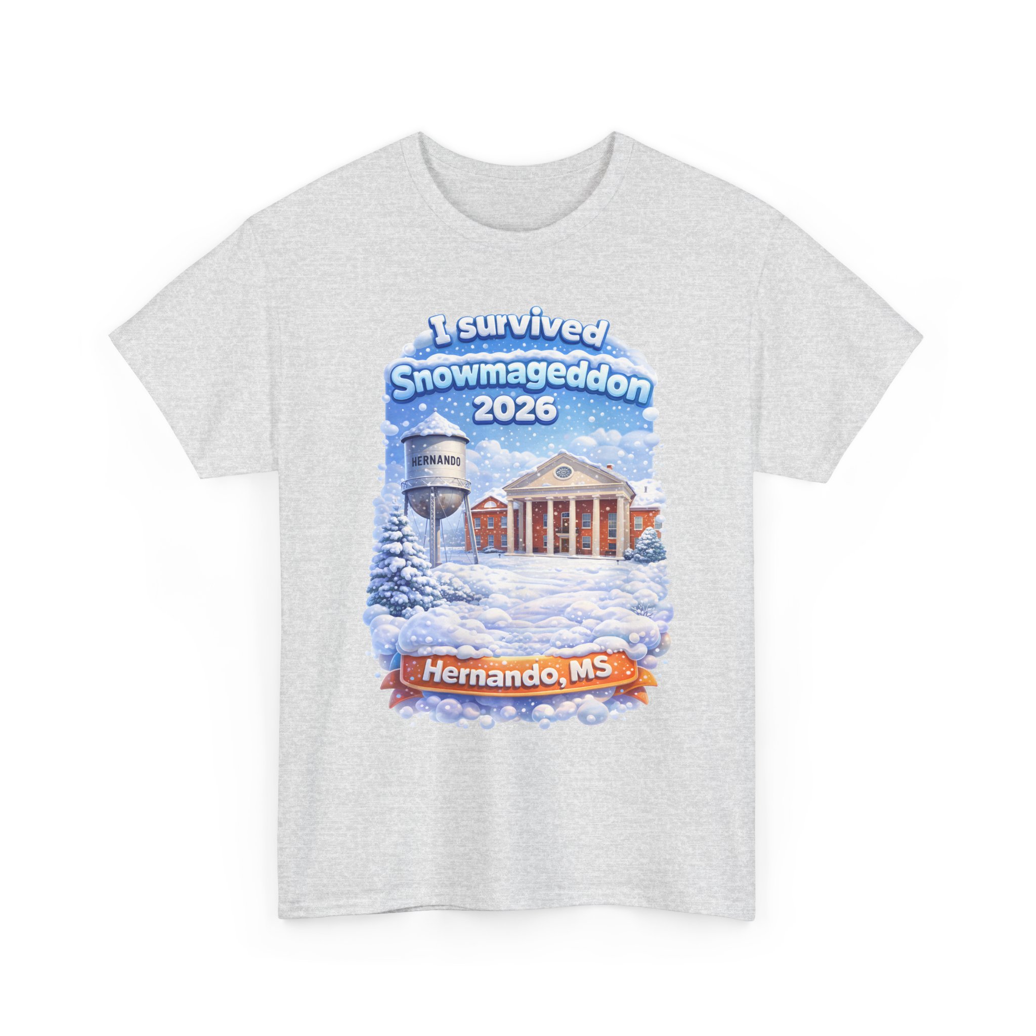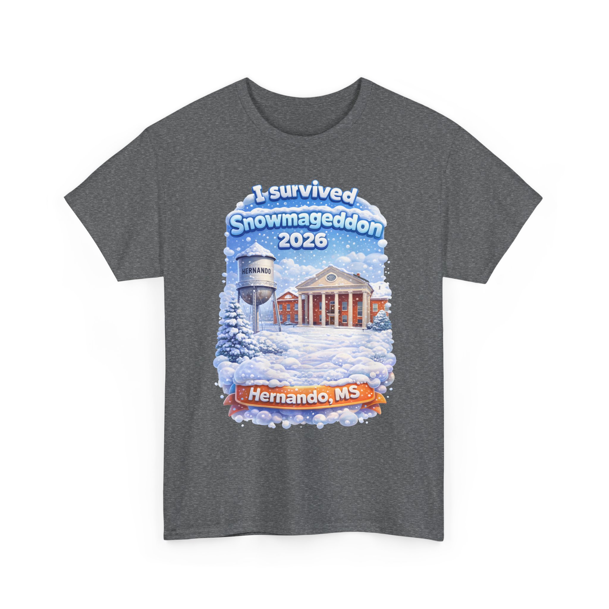 Special Graphic T-shirt Design. Snowy scene with text saying “I Survived Snowmageddon 2026 Hernando, MS” with the Hernando Courthouse and water tower.