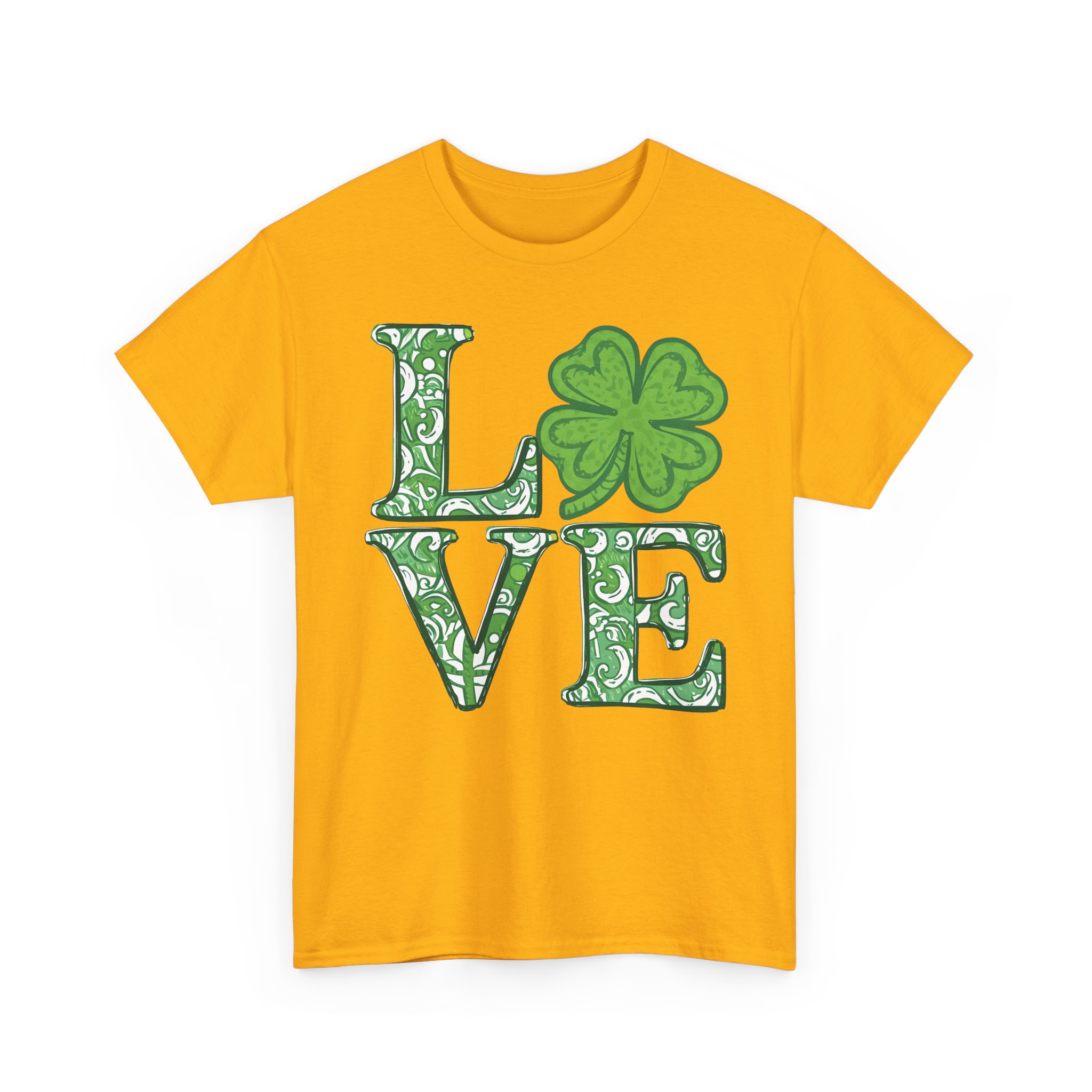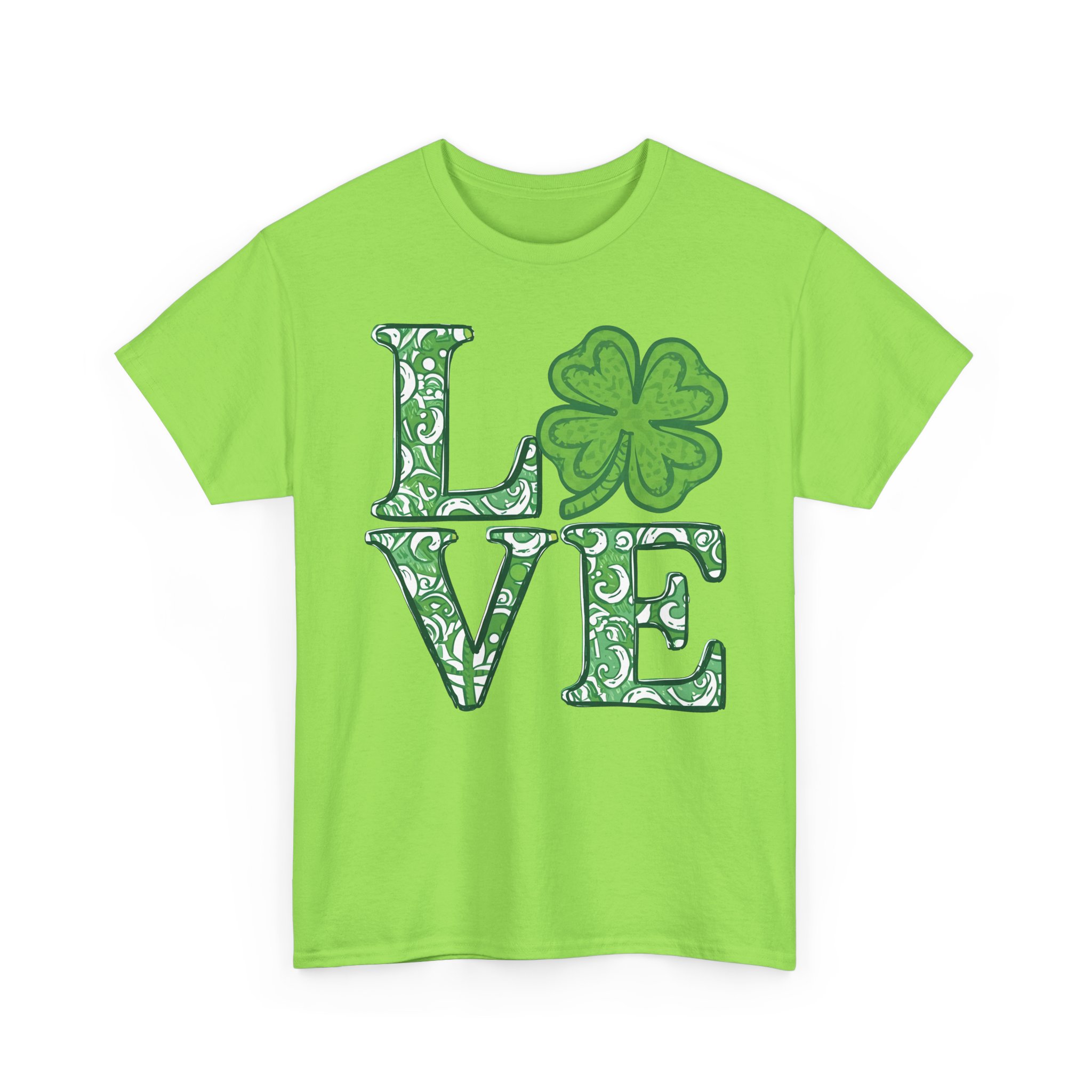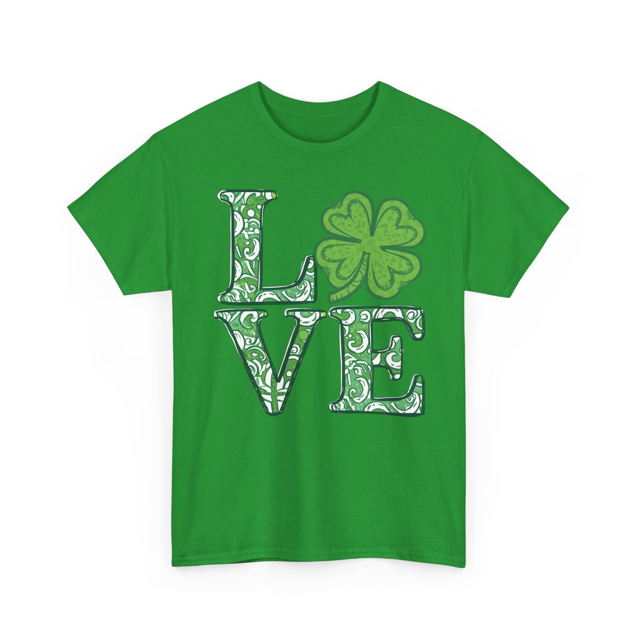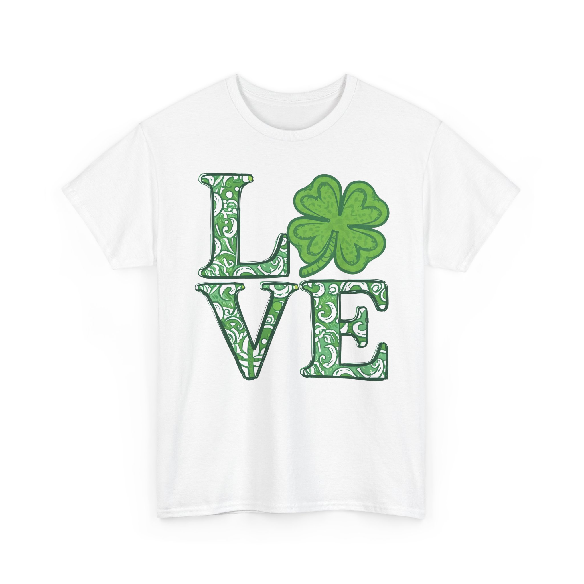 Holiday Graphic T-shirt Design. The word “Love” with a clover for the ‘O’, in shades of green and white, the letters and clover are all filled with a similar paisley style pattern.