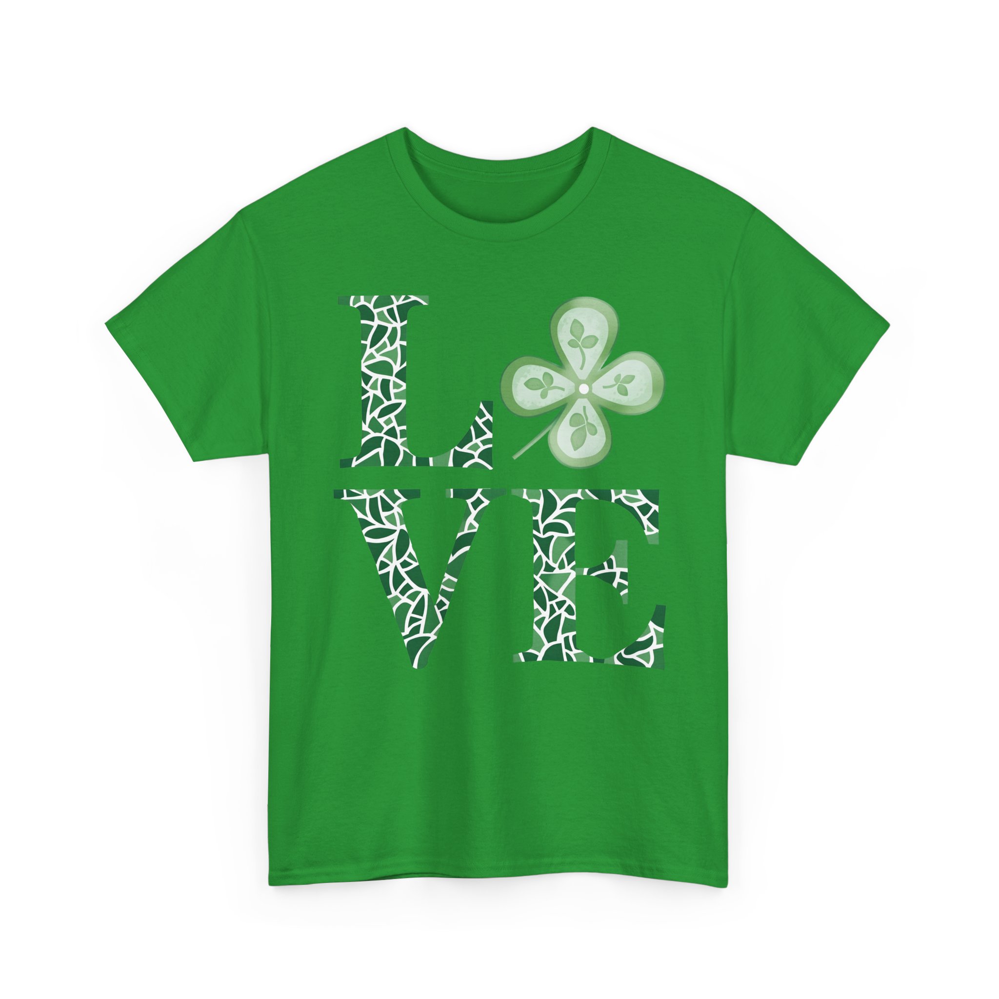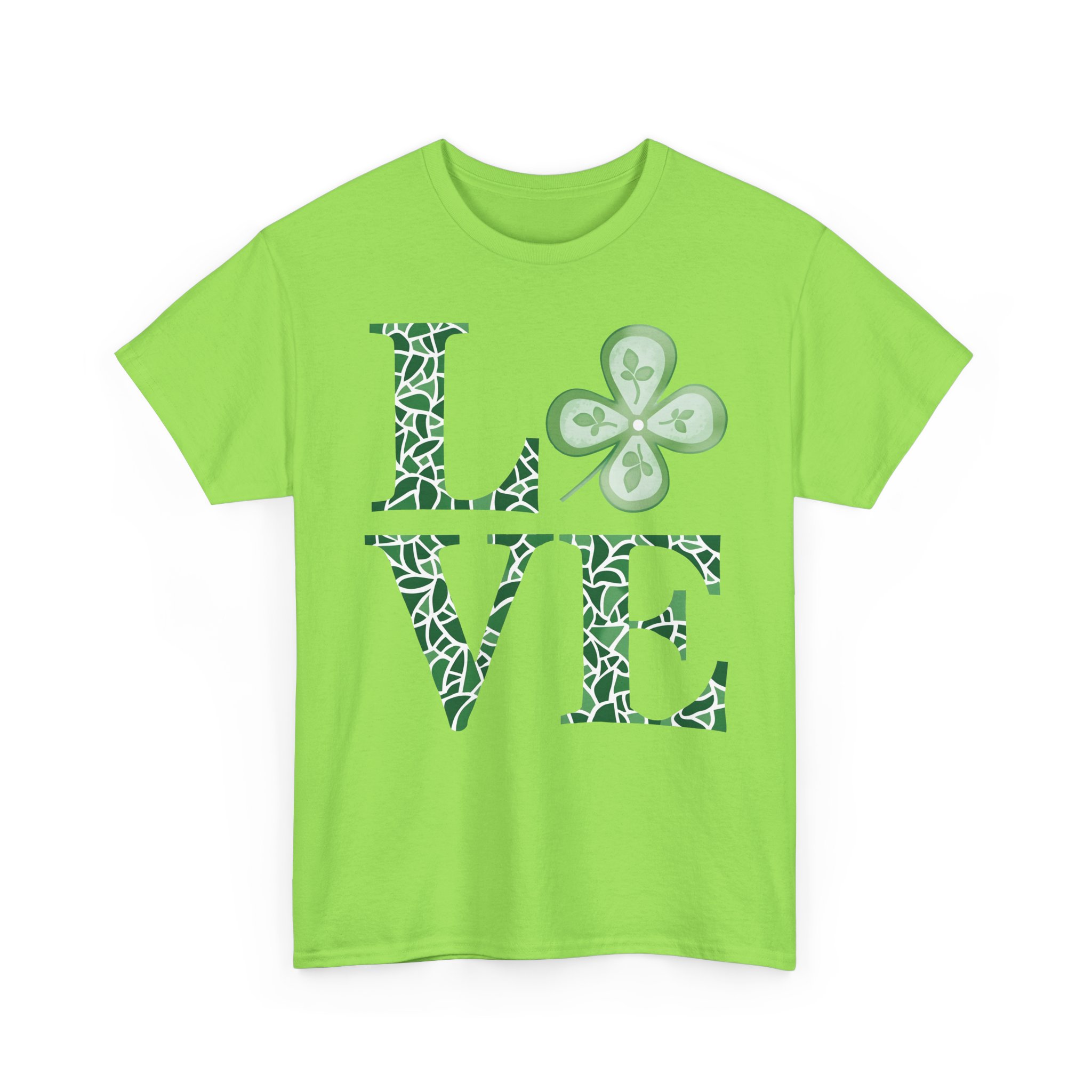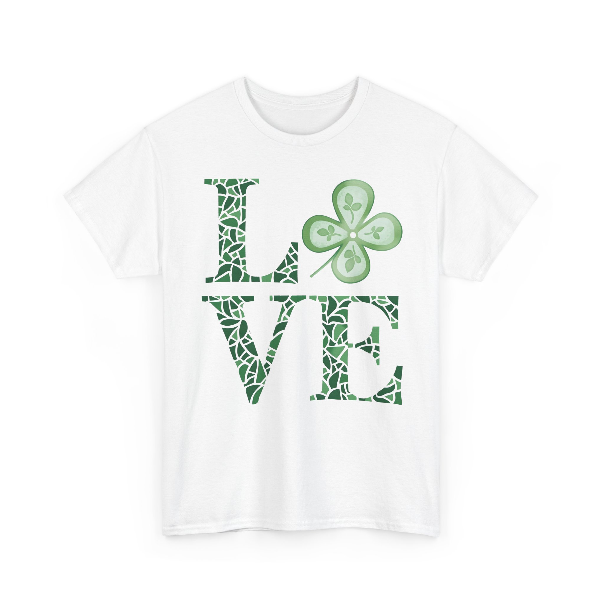 Holiday Graphic T-shirt Design. The word “Love” with a clover for the ‘O’, in shades of green and white, the letters and clover are all filled with a similar mosaic style pattern.