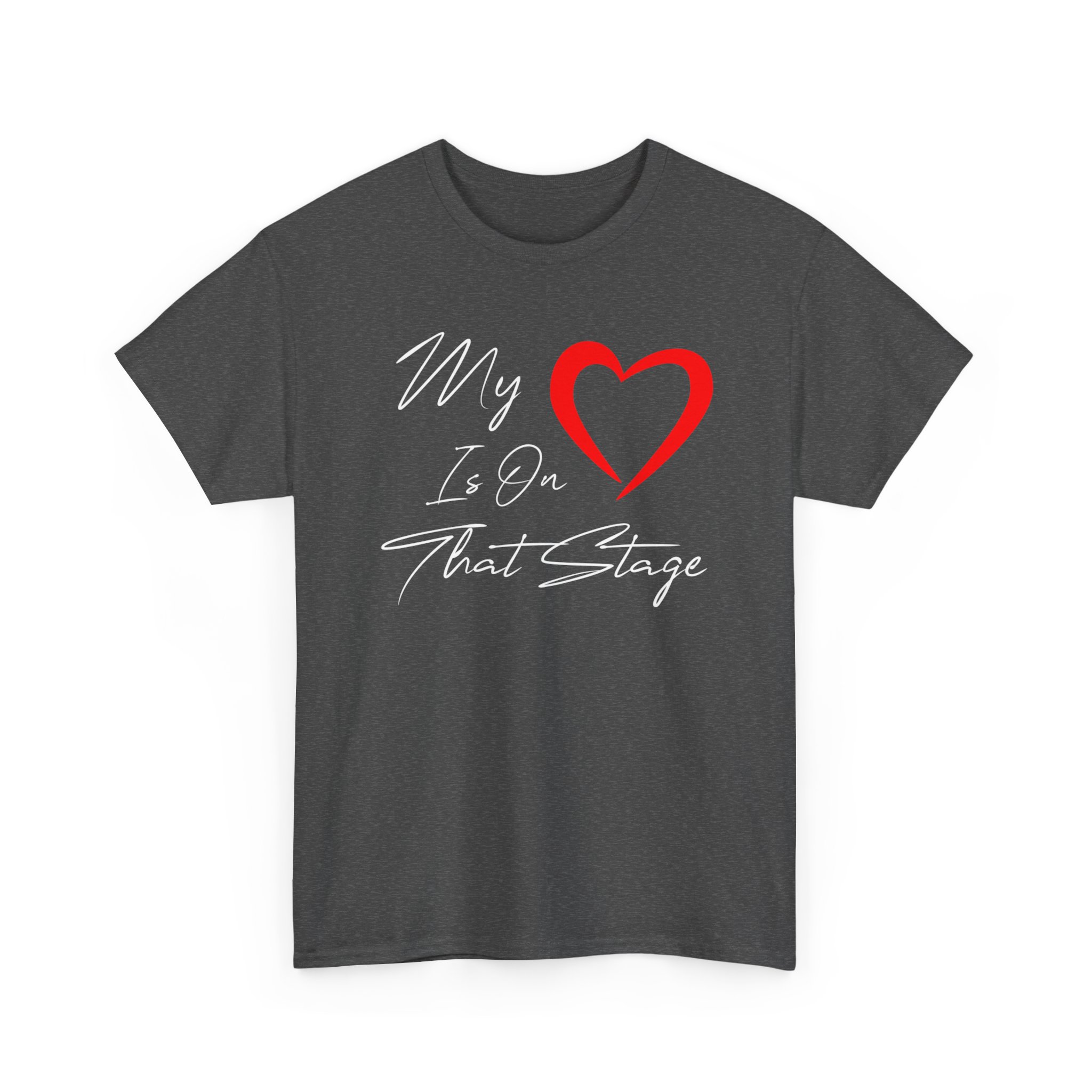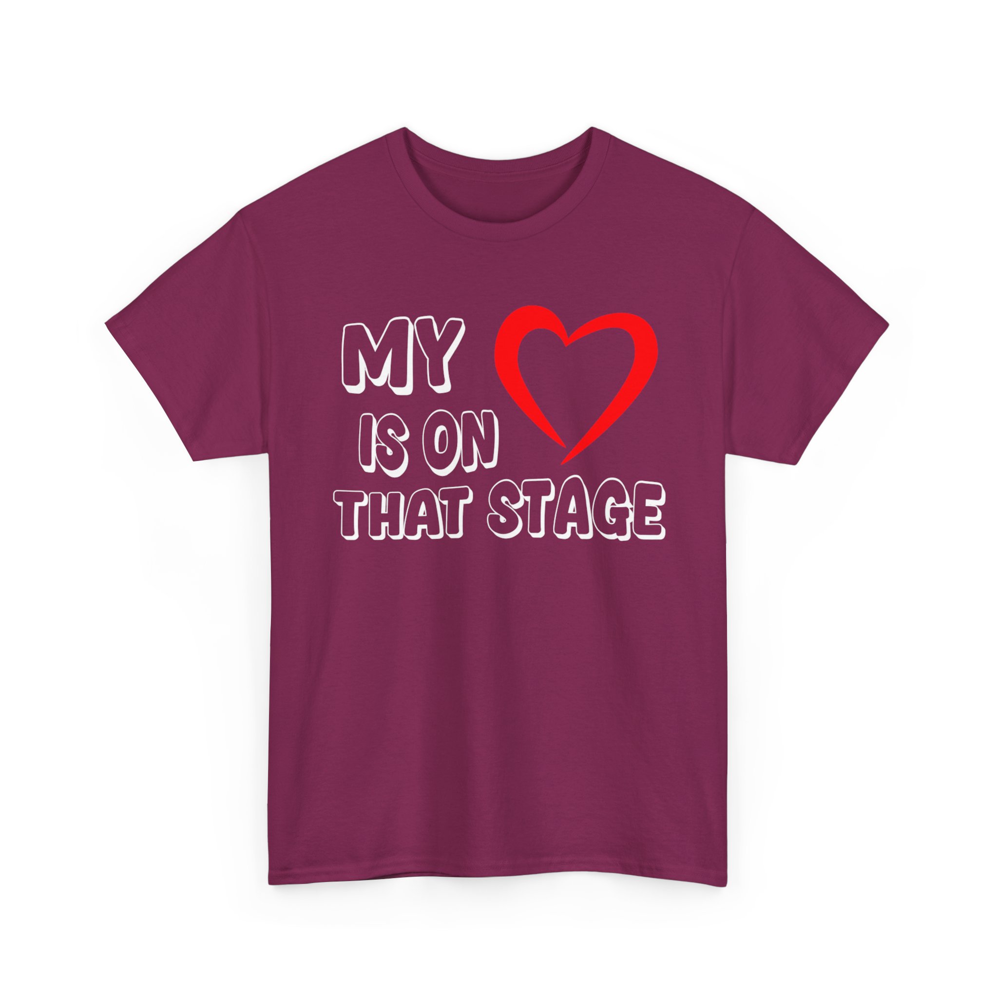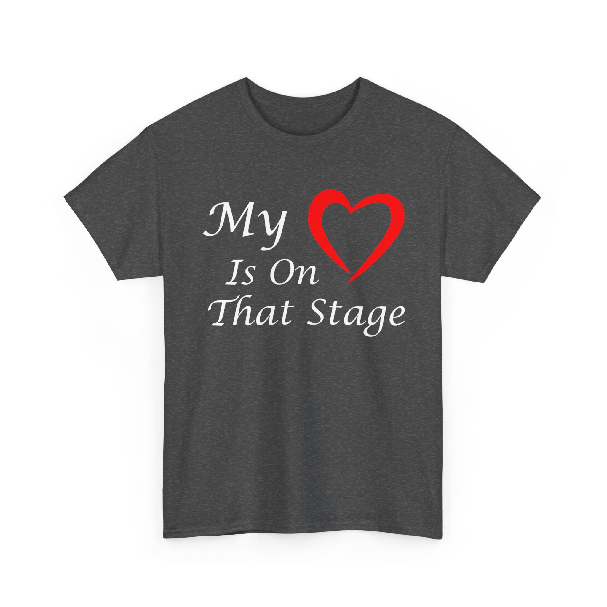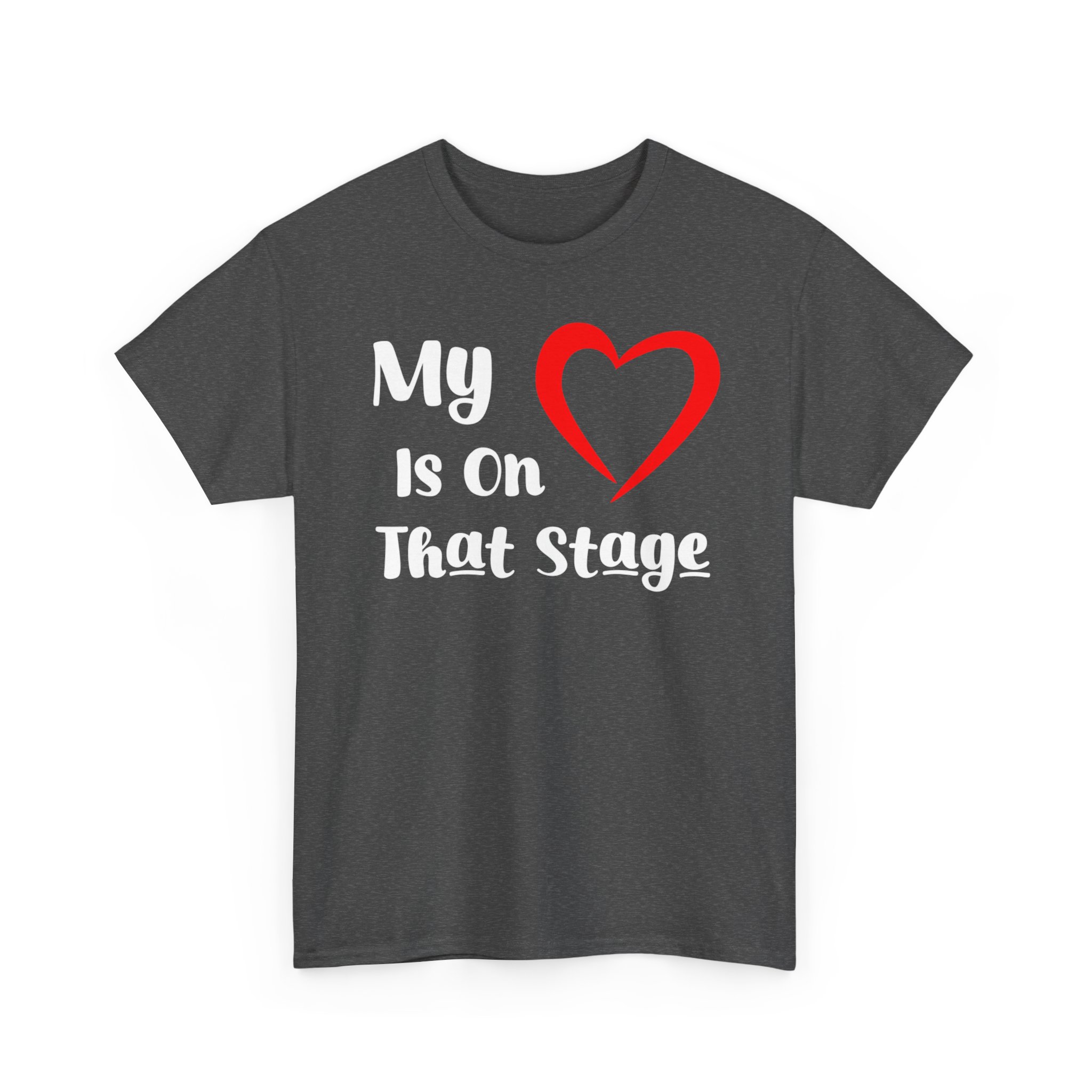 Theater Graphic T-shirt Design. Image with quoted text saying “My love is on that stage” with a heart for “Love”.