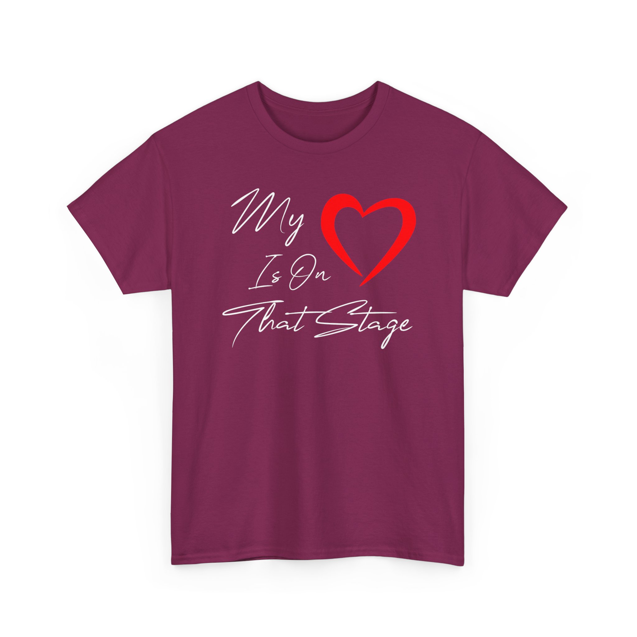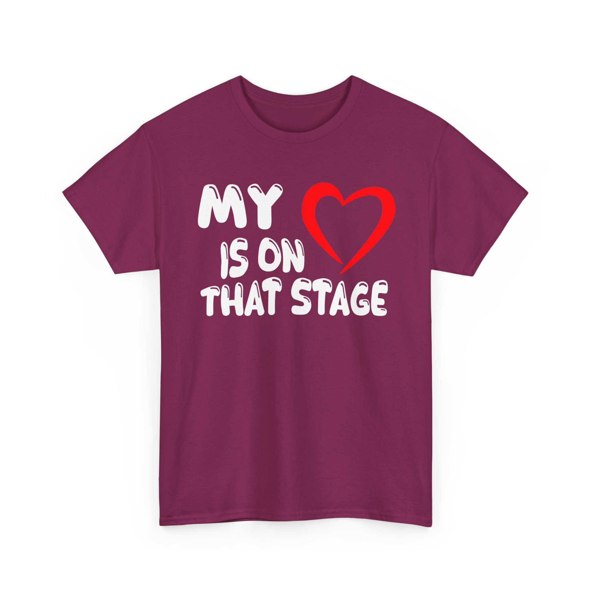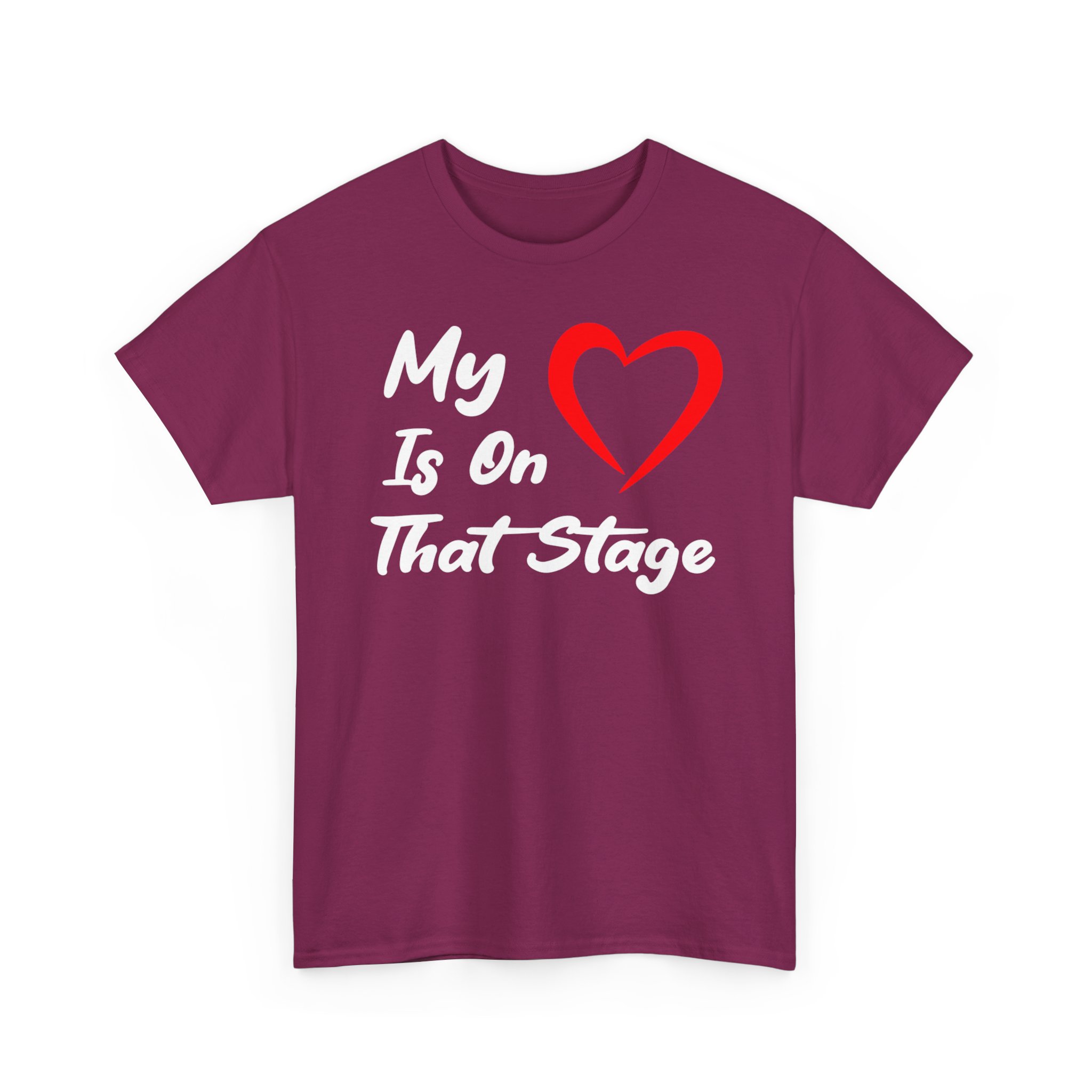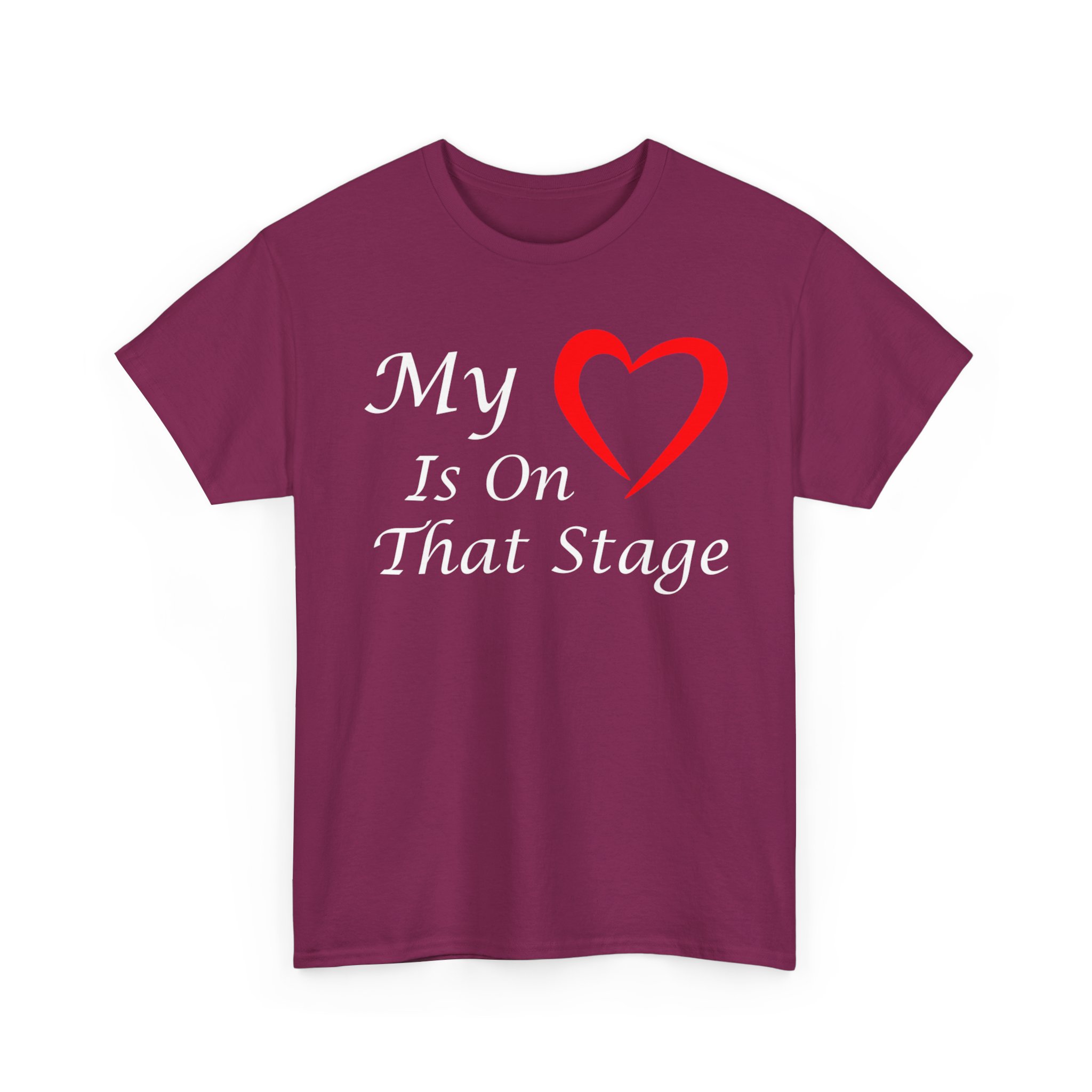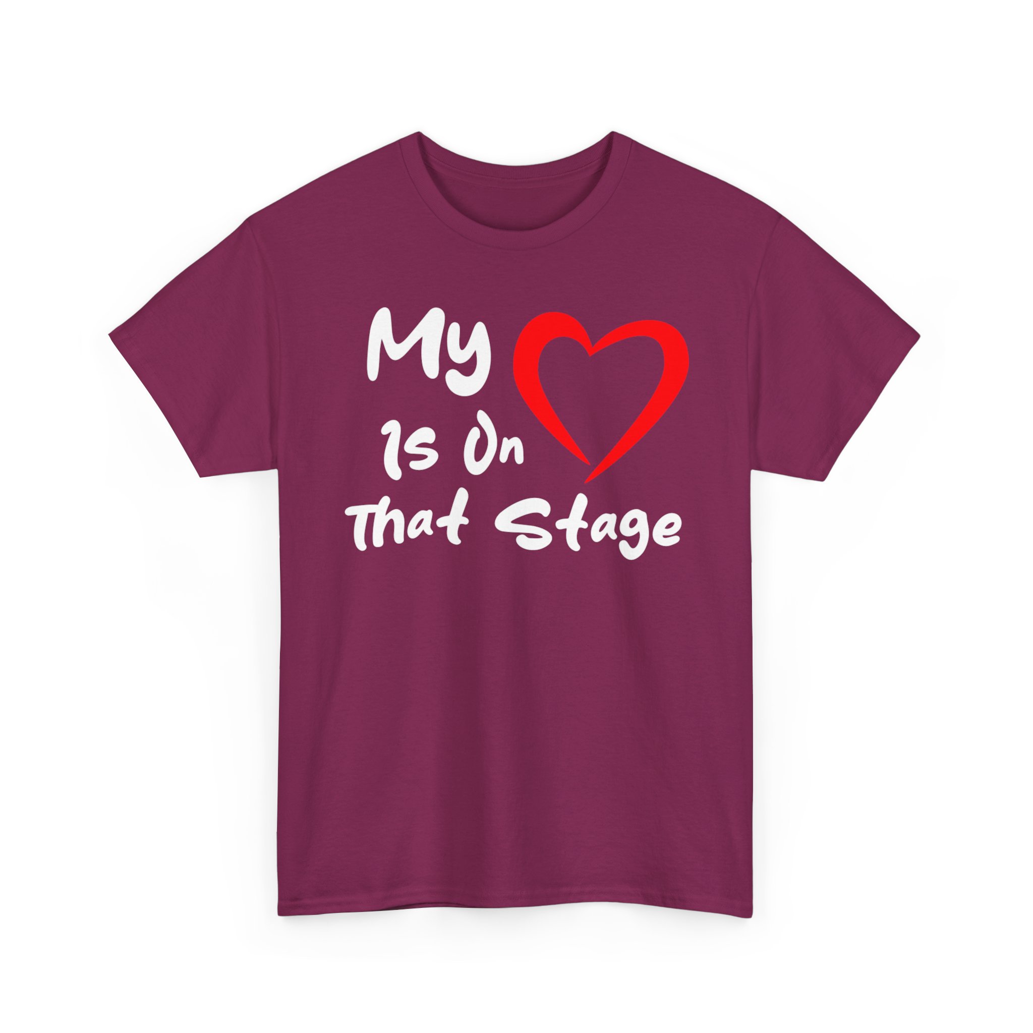 Theater Graphic T-shirt Design. Image with quoted text saying “My love is on that stage” with a heart for “Love”.