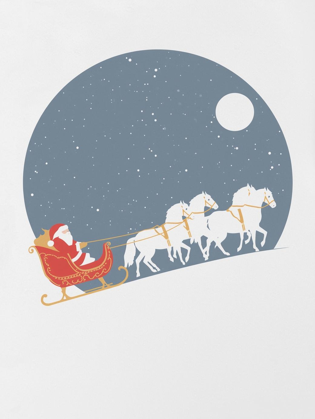 + Free ShippingSanta Graphic T-shirt Design. Santa in his sleigh being pulled by 4 white horses through a snowy hill under a moonlight sky