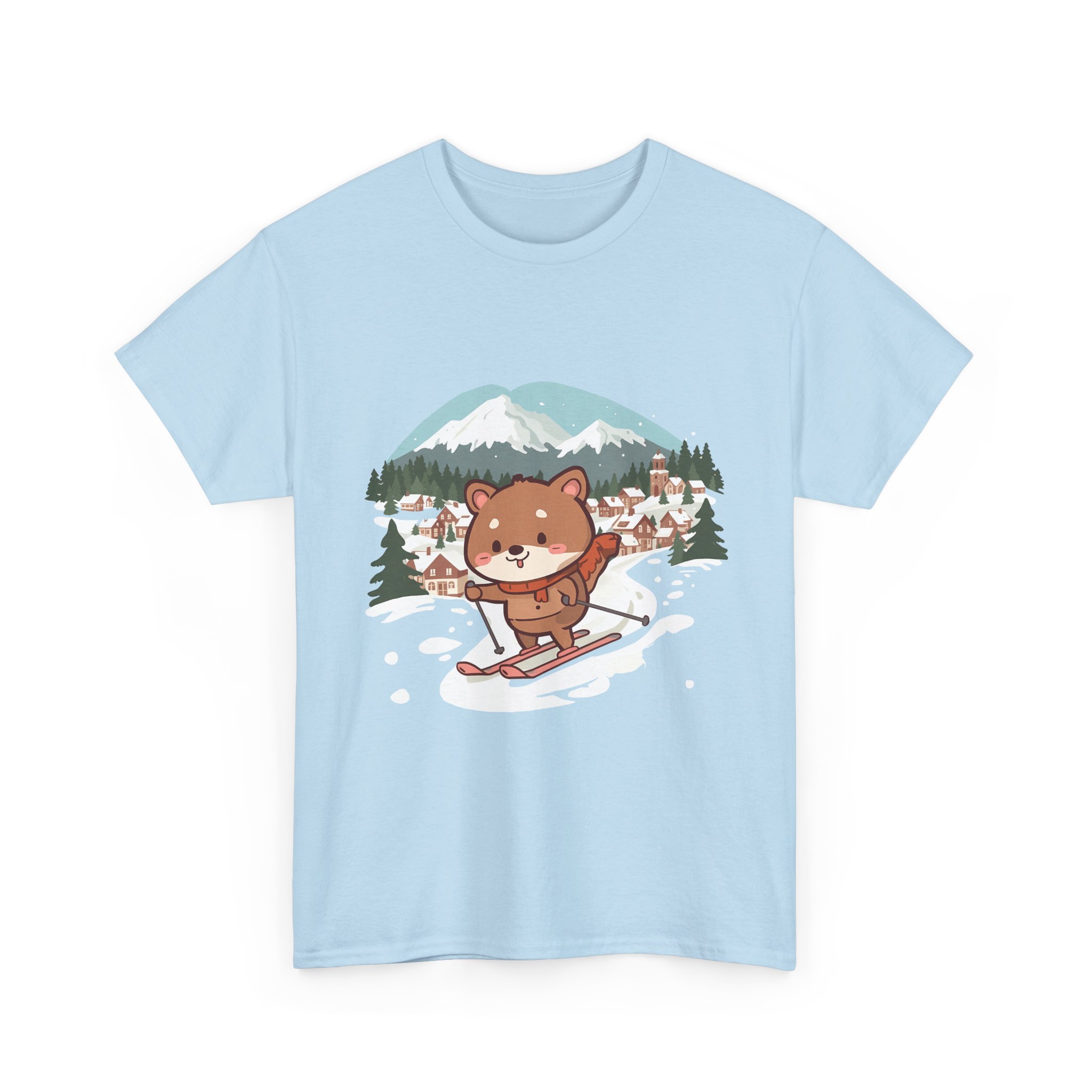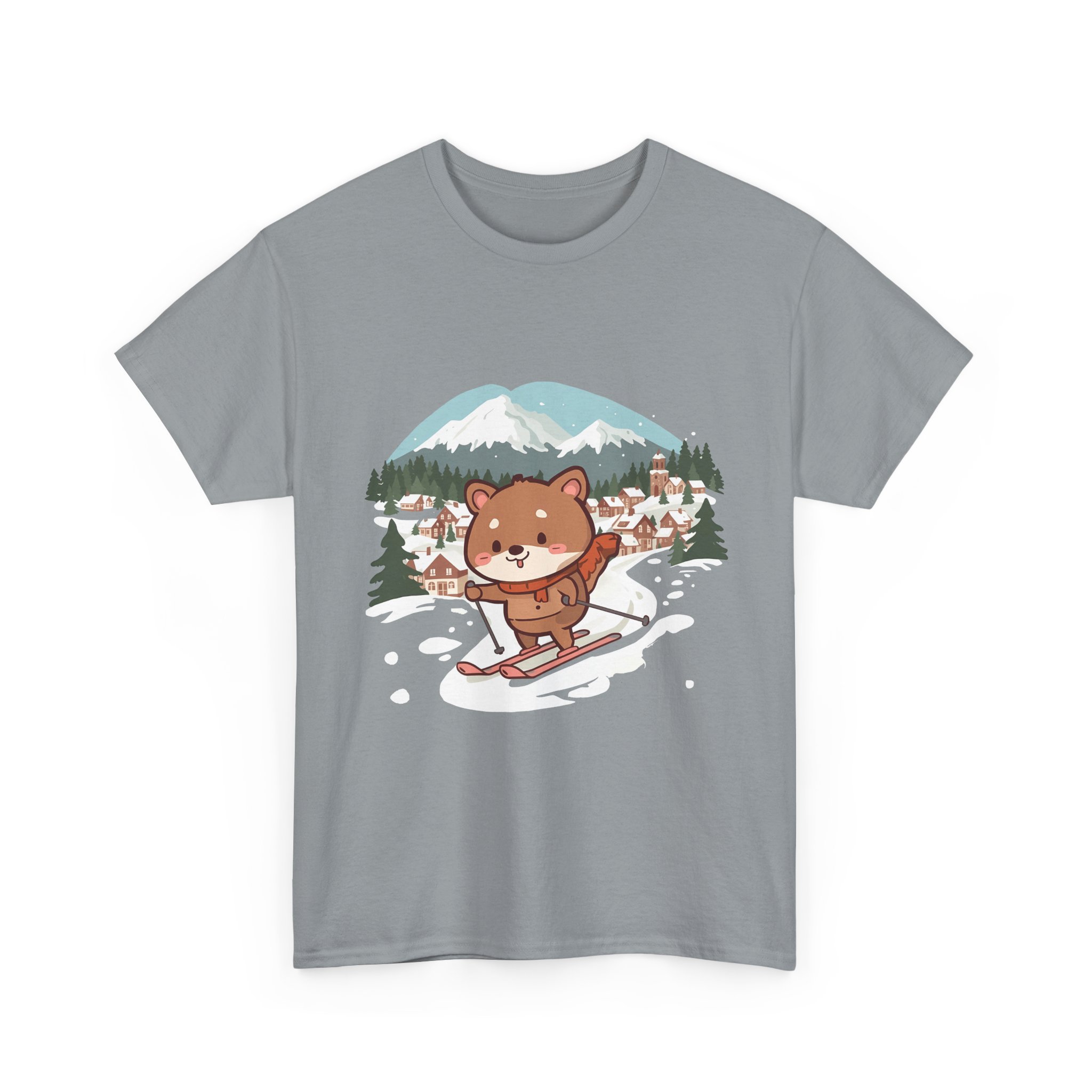 + Free ShippingA simple design for t-shirt showing cute animal skiing in the snow by a small town